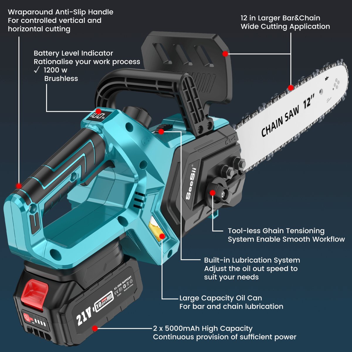 SeeSii M12 Ace Battery Chainsaw 12 Inch with 2*4000mAh Batteries